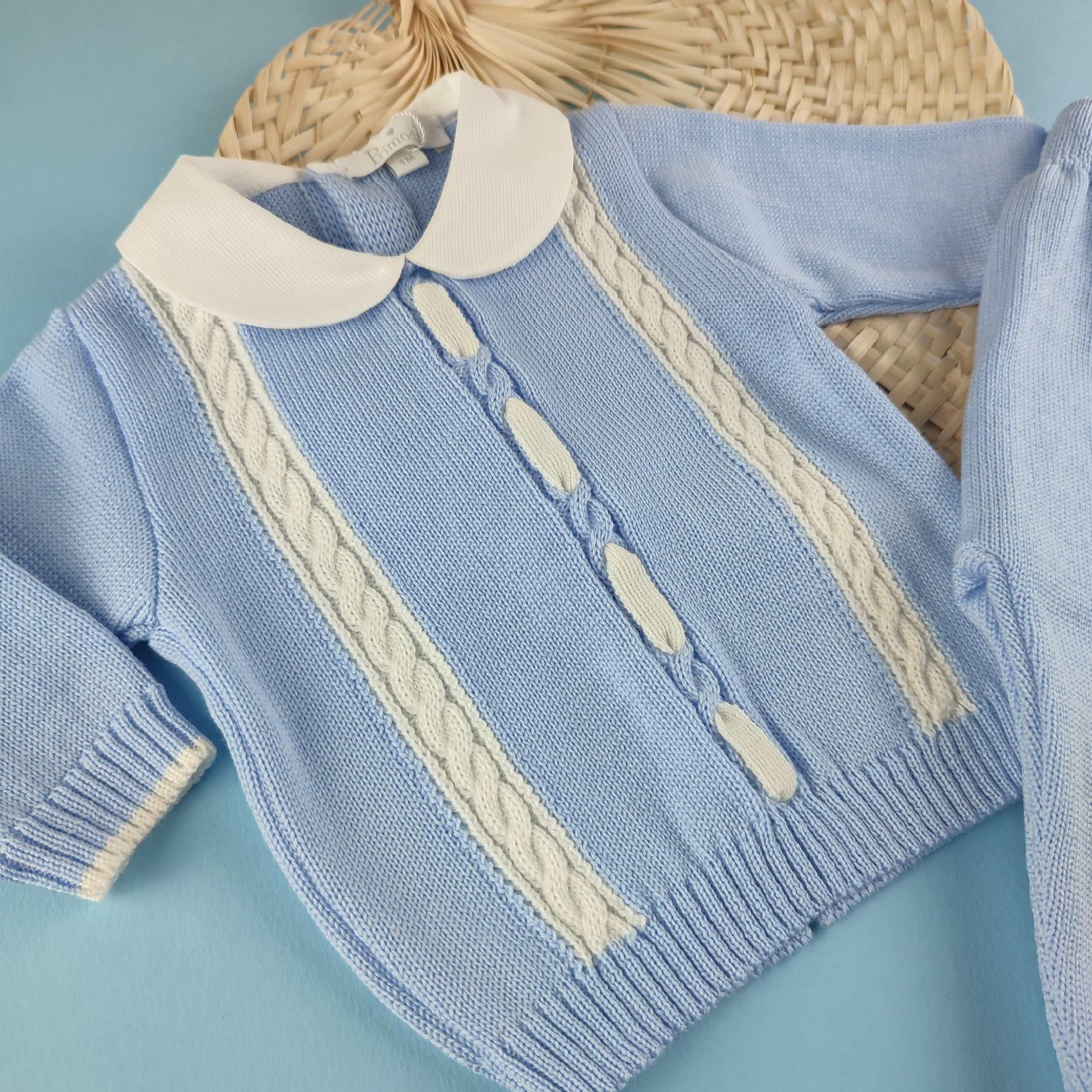 Completino nascita per neonato con trecce sul pettino, in 100% pura lana merino, una delicata fettuccia inserita a mano verticalmente.